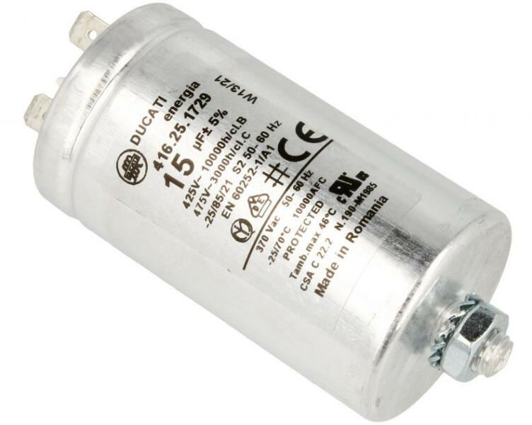 Kapacitás: 15 μF Feszültség: 475 V Gyártó: WHIRLPOOL/INDESIT Tipus: Zavarszűrő kondenzátor Kinézet: Radiális (álló) Magasság: 79 mm Átmérő: 40 mm Hőmérséklet: 85°C Tolerancia: 5% ROHS-konform: igen