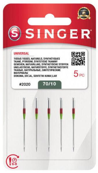 B ármely háztartási varrógéphez használható. (S2020N5) 1 levél tartalma 5db varrógéptű T űhegy: Normál Vastagsá g: 70 Normál anyagokhoz
