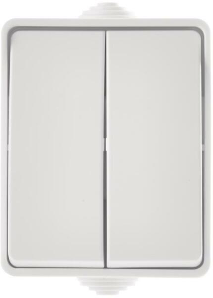Háztartási váltókapcsoló sz. 5 - csillár, vízálló. Alkalmazás: két lámpa kapcsolása egy helyről. Lehet két különböző lámpatest vagy egy nagy csillár, ahol két izzó (vagy két izzócsoport) külön világít. Kivitel: kettes kapcsoló Védelem: IP54. Szerelési módszer: falraFeszültség: 250V / 10AX.