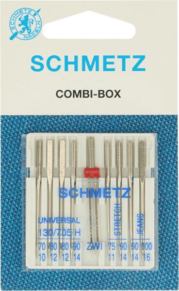 5db Schmetz univerzális varrógéptű készlet, 4 féle tűvel. A SCHMETZ gépi varrótűk a világ élvonalába tartozó termékei. Gyártva: USA Gyári kód: Combi-box Méretek: - 4 db univerzális tű: 70/10, 80/12, 90/14 130/705H - 2 db jeans, farmervarrótű, 90/14 és 100/16 - 2 db stretch tű, 90/14 és 75/11 - 1 db ikertű Színkód: vegyes A csomag tartalma: 9 varrógéptű Lapolt oldal