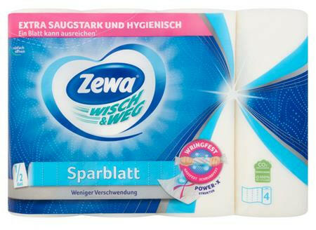 Háztartási papírtörlő, 2 rétegű, 4 tekercses, ZEWA "Wisch&Weg sparblatt" félbetéphető lapoknak köszönhetően mindig annyi használható belőlük, amennyire éppen szükség van így különösen költséghatékony megoldást nyújt kiemelkedő nedvszívóképességű többféle célra használhatók szétfoszlás nélkül nedvesíthetők, kicsavarhatók a többszöri használatér