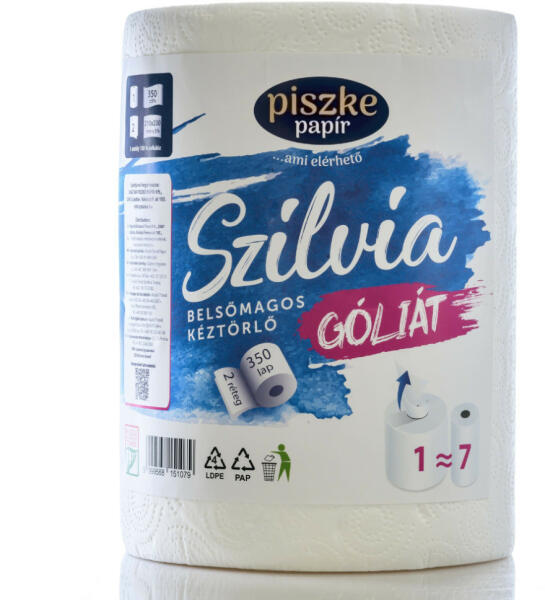 Szilvia Góliát belsőmagos 350 lapos, kétrétegű papírtörlő. Kiváló minőségű, jó nedvszívó képességű termék a tradicionális SZILVIA márkától. Szilvia Góliát 2 rétegű papírtörlő (350 lap) Ha papírtörlő akkor SZILVIA! A papírtörlő előnyei: 2 rétegű Puha és erős Illatmentes Festékmentes 100%-ban hazai feldolgozású termék