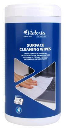 Tisztítókendő, általános felületre, 100 db, VICTORIA TECHNOLOGY -100 db tisztítófolyadékkal átitatott antisztatikus kendőt tartalmaz, melyek képernyők, PC-eszközök, számítógépházak, billentyűzetek, telefonok vagy egyéb készülékek műanyag felületeinek tisztítására alkalmasak -visszazárható fedél -környezetbarát (alkoholmentes) -a termék a gyártása során kevese