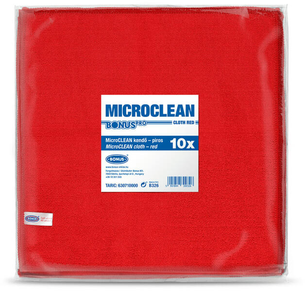 - Bonus Microclean mikroszálas kendő - 32x32 cm - piros színű - 10 db / csomag - 32 g / db (300 g/m2) - Tisztítószer nélkül is hatákonyan tisztít - Szárazon és nedvesen is használható - Használat után 60 °C fokon mosószer nélkül mosógépben kimosható