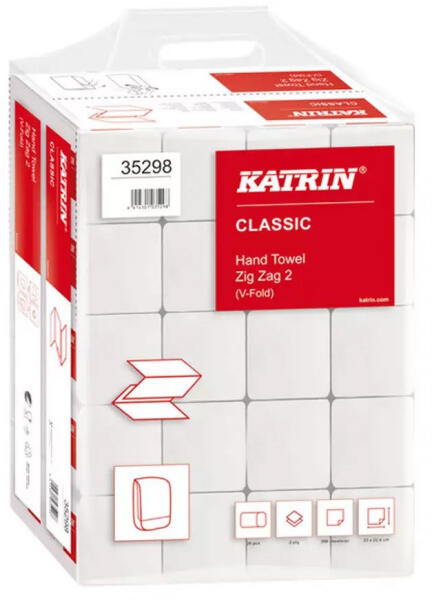 KÉZTÖRLŐ 2 RÉTEGŰ Z HAJTOGATÁSÚ 200 LAP/CSOMAG 20 CSOMAG/KARTON CLASSIC HANDY PACK KATRIN_35298 FEHÉRÍTETT Kiváló minőségű hajtogatott kéztörlő (Zig-Zag, V hajtott). Higiénikus egyenkénti lapadagolás, takarékos felhasználás. Az alacsony, vagy közepes forgalmú mosdóhelyiségekbe használható. Handy Pack csomagolás: az ergonomikus fogantyújánál fogva könnyen szállít
