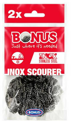 Inox fémsúroló, spirál, 2 db, BONUS A BONUS INOX spirál fémdörzsi különlegessége, hogy gombolyag kialakítású rozsdamentes acélból készült. Extra hatékony, rugalmasságának és finom acélszálainak köszönhetően kíméletesen súrol, használható a tepsibe égett ételmaradékok eltávolításához, a vízkő ellen, vagy akár a sütő takarítására. 2 db/csomag