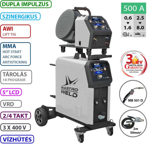 Garancia: akár 3 év (1+1+1 év, ami regisztrációhoz kötött) EDITION 2025 - Magyar nyelvű továbbfejlesztett menürendszer! Megújult desing. SZINERGIKUS VEZÉRLÉSŰ DUPLA IMPULZUS FOGYÓELEKTRÓDÁS ÍVHEGESZTŐ DUPLA VEZÉRLŐFELÜLETTEL DC-MIG ∙ Impulzus MIG, Dupla impulzus MIG ∙ MMA (bevontelektródás) és Lift-TIG gyújtású AWI hegesztés Mikroprocesszoros vezérlés a magas min
