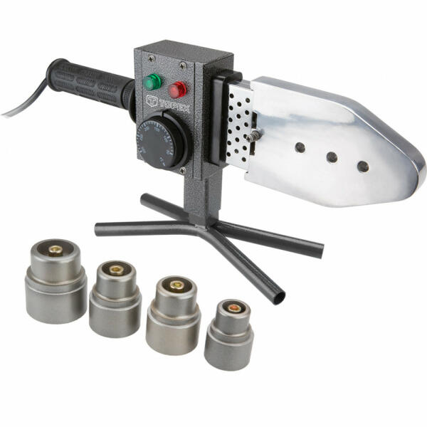 TOPEX 800 W teljesítményű műanyagcső hegesztő készülék, PE, PP és PB anyagú csövekhez. Max. 40 mm átmérőjű összekötőelemek, csövek és csőidomok hegesztéséhez. A készletben 4 db, 20, 25, 32 és 40 mm-es csőhegesztő idomokkal A csőhegesztő idomok élettartamukat megnövelő teflon bevonatot kaptak. A hegesztőfej 0-300 °C hőmérséklete garantálja a hatékony hegeszt