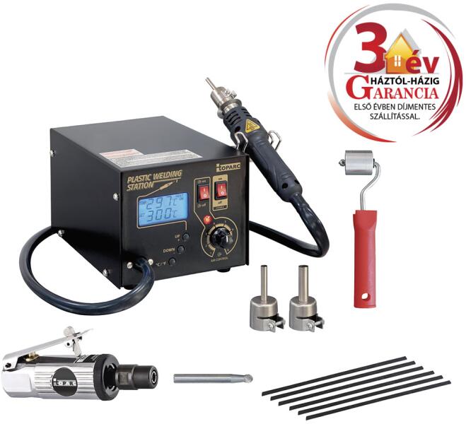 Garancia : 3 év (1+1+1 év, ami regisztrációhoz kötött) A könnyen használható forrólevegős műanyag hegesztőállomás (2 db fúvókával Ø 5 mm + Ø 8 mm) a járművek műanyag alkatrészeinek hegesztésére szolgál. Az állítható, széles hőmérséklet-tartomány (160-480°C) a műanyagok hőmérsékletét olvadáspontjukig emeli, így azok puhává és könnyen javíthatóvá vá