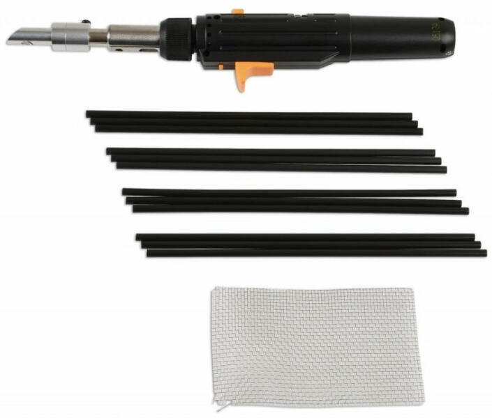 Műanyag hegesztő készlet, amely négy különböző típusú műanyag hegesztő pálcával van kiegészítve, amelyek alkalmasak kisebb törött vagy osztott műanyag alkatrészek, mint például tükrök javítására. Propán-bután gázzal működő, piezo gyújtású műanyag forrasztópáka. 1 db 100 mm x 60 mm-es rozsdamentes acélháló. 3 db 170 mm-es (PP) műanyag hegesztő rúd. 3 db