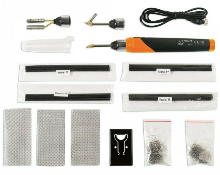 Műanyaghegesztő készlet, amely négy különböző típusú műanyag hegesztőpálcával van kiegészítve, amelyek alkalmasak kisebb törött vagy repedt műanyag alkatrészek, mint például tükrök, lökhárítók, sárvédő betétek, stb. javítására. Komplett műanyag javító készlet újratölthető Li-ion akkumulátorral (2400 mAh). Tartalom: 1 db újratölthető akkus műanyag forr