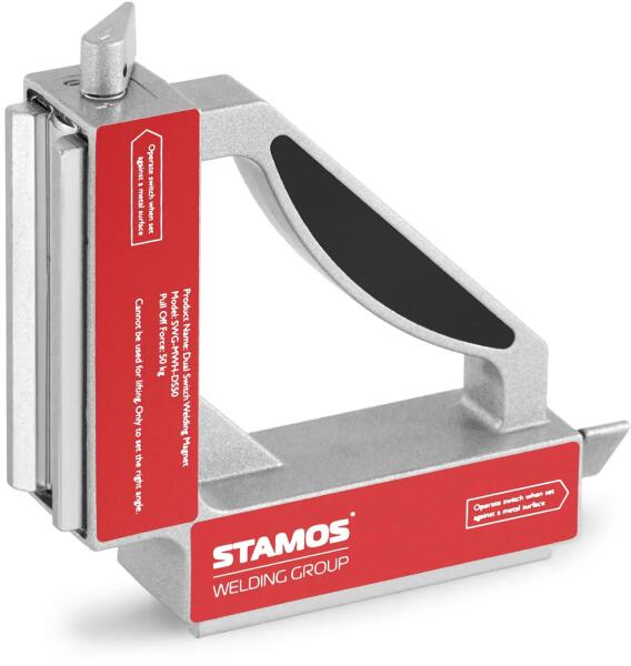 A Stamos Welding Group hegesztőmágnest kifejezetten fémelemeken való használatra tervezték, és erős mágneses kapcsolatot biztosít az egyes munkadarabok között, amelyet két kapcsolóval kapcsolhat be és ki. A robusztus szögbeállító 90°-os szögben rögzíthető, és optimális tartóként szolgál a fém alkatrészekhez hegesztési, forrasztási vagy más professzionális szerel