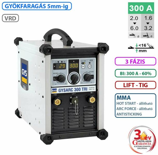 Garancia: 3 év (1+1+1 év, ami regisztrációhoz kötött) BEVONTELEKTR ÓDÁS HEGESZTŐ INVERTER LIFT-TIG AWI FUNKCIÓVAL Az inverteres technológiával a GYSARC 300 TRI egy 3 fázisú MMA (SMAW) / TIG (GTAW) hegesztő áramforrás, kivételes hegesztési teljesítménnyel. Ez a fejlett elektronikával rendelkező termék maximális termelékenységet garantál még zord körülmények között