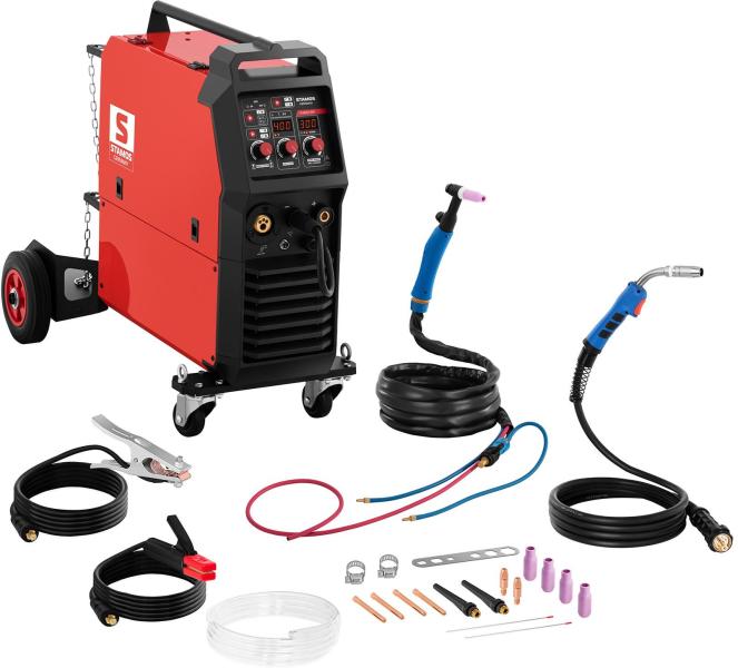 Nagy teljesítményű kombinált hegesztőgép minden szokásos hegesztéshez A Stamos Germany erőteljes S-MULTI 300 profi hegesztő gépe lenyűgöző az univerzális alkalmazhatósága, valamint az alacsony hibaszintű, jó minőségű hegesztések miatt. Hogy védőmaszkkal vagy anélkül hegeszt, a négy hegesztési mód MIG/MAG, TIG, MMA, vagy FCAW -nak hála a kombinált hegesztő géppel m