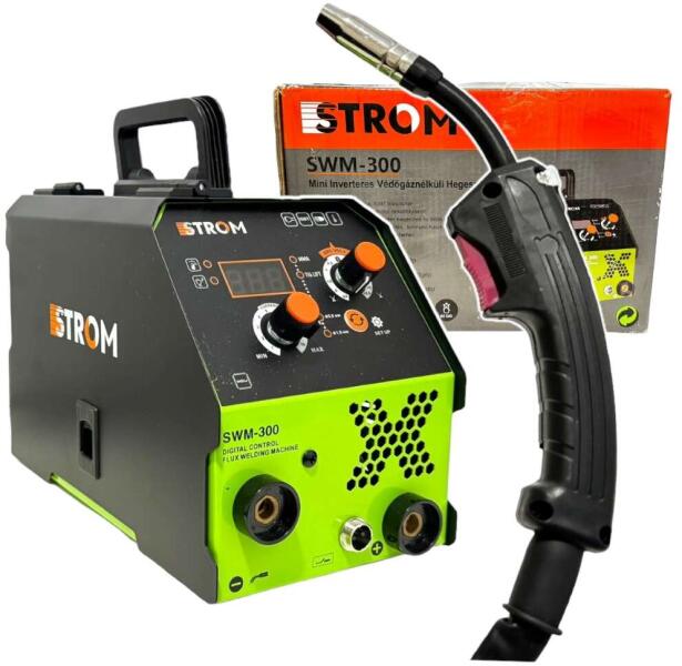 Termék főbb tulajdonságai- Márka: Strom - Termékkód: SWM-300 - Típus: Mini Inverteres Védőgáz Nélküli CO2 Hegesztőgép - Hegesztőáram: 20-300A - Bemeneti feszültség: 230V 50-60Hz - Üresjárati feszültség: 52V - Porbeles huzal méret: 0,8mm / 1,0mm - Elektróda méret (MMA): 1mm-5mm - Védettség: IP21S - Szigetelési osztály: F - Súly: 7kg - Hűtés: Ventilátoros hűtés - T