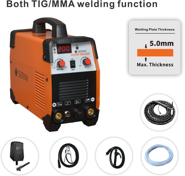 A FireTIG 200 ECO DC hegesztőgép egy sokoldalú eszköz, amelyet mind TIG (Tungsten Inert Gas) és MMA (kézi fémíves) hegesztéshez terveztek. Ez a kettős funkcionalitás ideálissá teszi különféle hegesztési feladatokhoz, akár szénacéllal dolgozik MMA módban, akár rozsdamentes acéllal TIG módban. A gép akár 5 mm-es hegesztőlemez vastagságot is támogat, így erős és megbí