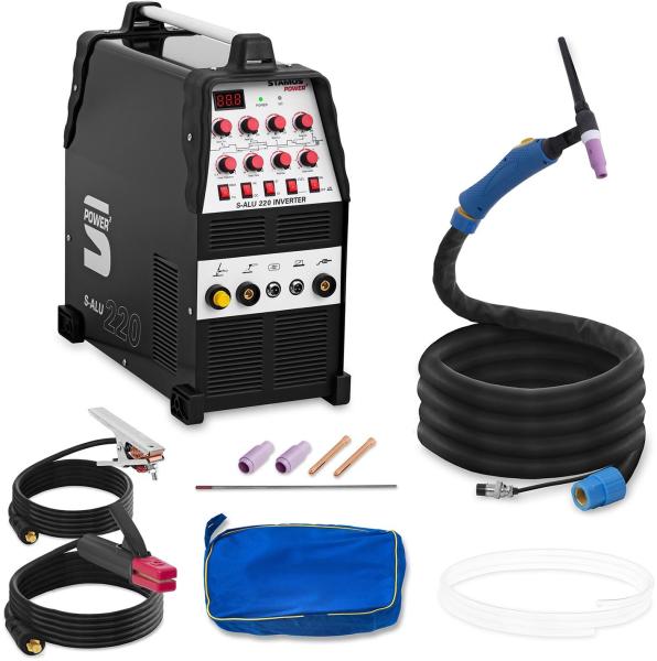 Alumínium hegesztő - 200 A - 230 V - Impulzus - 2/4 Ütem A Stamos Power S-ALU hegesztőgéppel ön egy professzionális AWI (TIG) és MMA hegesztésre alkalmas gépet kap. Ezzel az erőteljes hegesztőgéppel önnek lehetősége van, a hegesztett fém függvényében, egyen-, vagy váltóárammal való hegesztésre. Váltóárammal (AC) lehetősége van a könnyű fémek megmunkálásához, min
