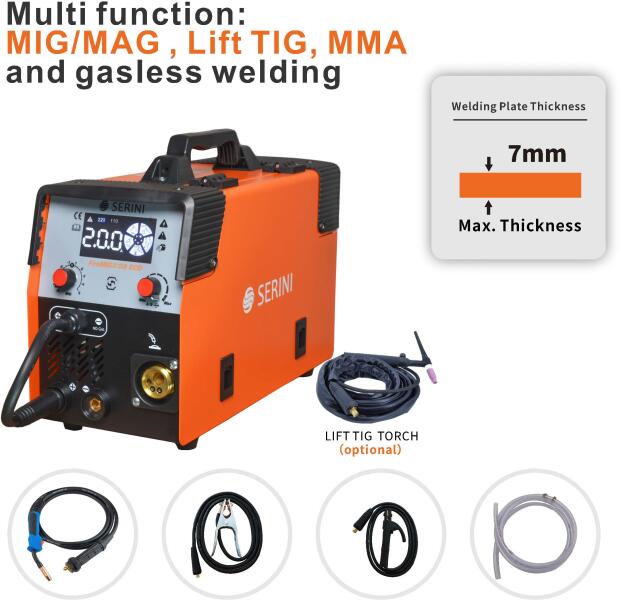 A FireMIG 200 ECO hegesztőgép egy rendkívül sokoldalú és hatékony eszköz, amely számos hegesztési feladatra alkalmas. Ez a multifunkciós hegesztőgép rendelkezik MIG/MAG, Lift TIG, MMA és védőgázas nélküli hegesztési opciókkal, így kiváló választás a különféle alkalmazásokhoz. Legfeljebb 7 mm vastagságú lemezek hegesztésére képes, így ideális könnyű és közep