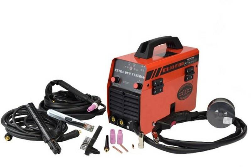 HETRA Duo Synergic porbeles hegesztőgép MIG/MAG/AWI 120A Hetra Duo Synergic egyfázisú, multifunkciós, porbeles hegesztőgép kifejezetten porbeles huzallal történő hegesztéshez max. 3,2mm elektróda vastagságig. A hegesztőgép súlya kevesebb mint 6 kg, így könnyedén hordozható. Maximum 1 kg-os huzallal használható. A készülék alkalmas: FLUX üzemmódban 0,8 vagy 0,9mm-es port
