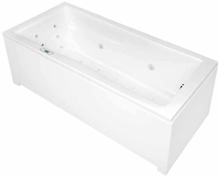Előlapos fürdőkád vízmasszázs rendszerrel, pneumatikus vezérléssel|Méret: 180x85 cm|Szín: fehér|Kád anyaga: 100% Öntött Szaniterakril|Kád térfogata: 285 l|Az ár tartalmazza a előlapot és a kádvázat is. |Vízmasszázs rendszer:|vízszivattyú|vízfúvóka|pn eumatikus bekapcsolás|min-max levegőáramlás szabályozó|túlfolyó készlet|fu¨rdőkád lábazata