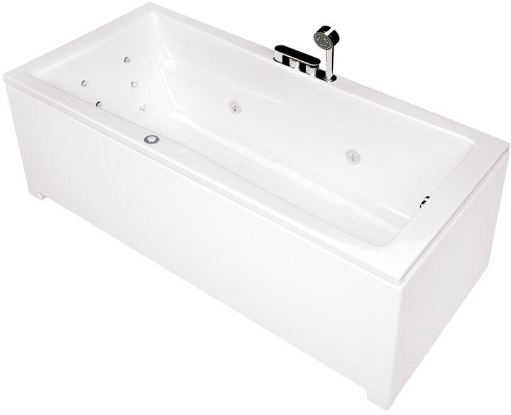 Előlapos egyenes kád vízmasszázs rendszerrel, pneumatikus vezérléssel|Méret: 190x90 cm|Kád anyaga: 100% Öntött Szaniterakril|Szín: fehér|Kád térfogata: 310 l|Vízmasszázs rendszer:|vízszivattyú|vízfúvóka|pn eumatikus bekapcsolás|min-max levegőáramlás szabályozó|túlfolyó készlet|fu¨rdőkád lábazata