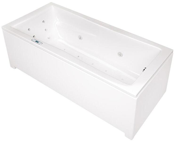 Előlapos egyenes kád vízmasszázs rendszerrel, pneumatikus vezérléssel|Méret: 180x80 cm|Kád anyaga: 100% Öntött Szaniterakril|Szín: fehér|Kád térfogata: 285 l|Vízmasszázs rendszer:|vízszivattyú|vízfúvóka|pn eumatikus bekapcsolás|min-max levegőáramlás szabályozó|túlfolyó készlet|fu¨rdőkád lábazata