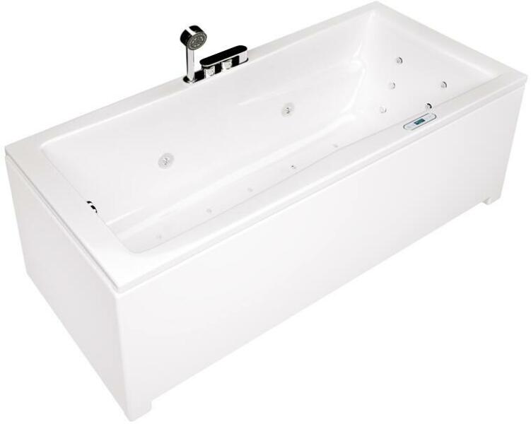 Előlapos fürdőkád vízmasszázs rendszerrel, mikrofúvókákkal, pneumatikus vezérléssel|Méret: 190x90 cm|Szín: fehér|Kád anyaga: 100% Öntött Szaniterakril|Az ár tartalmazza a előlapot és a kádvázat is. |Vízmasszázs rendszer:|vízszivattyú|vízfúvóka|pn eumatikus bekapcsolás|min-max levegőáramlás szabályozó|túlfolyó készlet|fu¨rdőkád lábazata