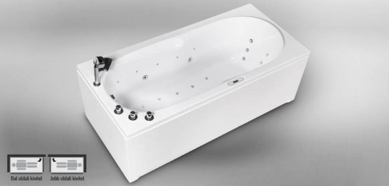Előlapos egyenes kád kombinált (levegő+víz) masszázsrendszerrel, mikro fúvókákkal, elektronikus vezérléssel|Méret: 170x80 cm|Kád anyaga: 100% Öntött Szaniterakril|Szín: fehér|Kád térfogata: 235 l|Víz-és levegőmasszázs rendszer:|levegőszivattyú|vízszivatty ú|szuper vízfúvóka|levegőfúvóka|a víz- és a levegőszivattyú elektronikai bekapcsolása|a levegőszivattyú