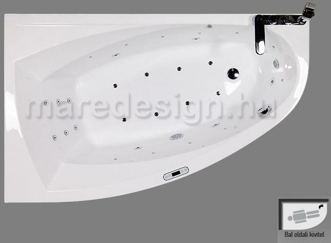 Matana E-Ma x érintőgombos vezérlésű hidromasszázs kád Egyedi kialakítású asszimetrikus sarokkád. Letisztult formája a legigényesebb fürdőszobában is megállja a helyét. Érintőgombos vezérlésű 22 fúvókás masszázsrendszer, vízhőfoktartó renszere és exkluzív 11 ledes színterápiás világítással kényzteti használóját a fáradt mindennapokban. Pezsgőfürdő moto