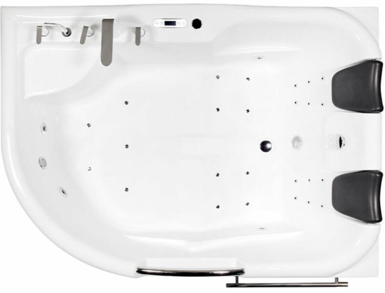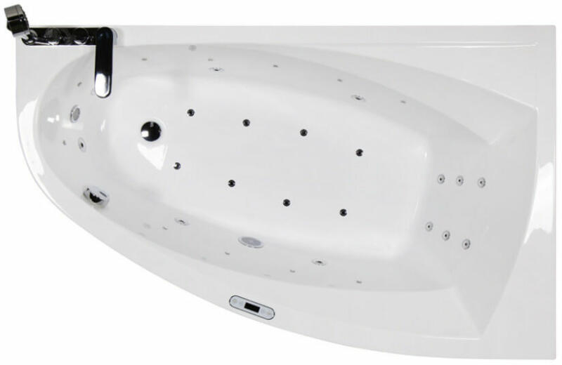 Aszimmetrikus sarokkád előlappal, vízmasszázs rendszerrel, pneumatikus vezérléssel|Méret: 170x110 cm|Balos kivitel|Kád anyaga: 100% Öntött Szaniterakril|Szín: fehér|Kád térfogata: 305 l|Vízmasszázs rendszer:|vízszivattyú|vízfúvóka|pn eumatikus bekapcsolás|min-max levegőáramlás szabályozó|túlfolyó készlet|fu¨rdőkád lábazata