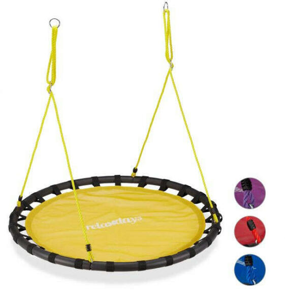 Szórakoztató kerek függő hinta gyerekeknek és felnőtteknek, kültéren vagy beltéren egyaránt használható. Erős, állítható magasságú kötelekkel. Kényelmes ülve vagy fekve. Gyorsan és egyszerűen összeállítható Átmérő: 120 cm Hinta kötél nélkül H x D: 5,5 x 120 cm Állítható H: 80 - 150 cm Ülés terület átmérő: 94 cm Max. 100 kg-ig terhelhető Súly: 3,6 kg Any