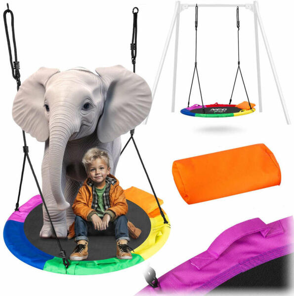 XXL gólyafészek hinta, tarka, 110 cm - SwingoNeo-Sport: 1050 Fő jellemzők: Kényelmes ülés Vízálló anyag Könnyen tisztítható Erős kötelek A SWINGO hinta remek szórakozást nyújt a fiatalabb és kicsit idősebb gyermekeknek egyaránt. Az acélvázú hinta lágy védőhabbal van borítva, erős anyagból készült, többszörös varrással és vastag felfüggesztő kötelekkel. Bizto
