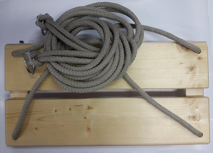 Fa hinta (fenyőfából), 1,7 m hosszú fonatolt kenderkötéllel. A hintát 540 fokos hajlított, minősített horogra kell felszerelni, ami nem tartozéka a csomagnak. Maximális terhelhetőség: 80 kg A ülőrész mérete: 50 x 25 cm