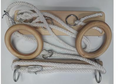 Tornakészlet garnitúra gyermekeknek fából, amely tartalmaz egy nyújtó rudat, 2 gimnasztika gyurut és egy hintát, illetve egy pár kötelet, melyen karabínerrel cserélhetoek a végei.