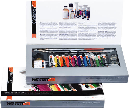 Cobra Artist olajfestékek - ajándék szett 10 x 40 ml + kiegészítők A Cobra Artist vízzel elegyedő olajfesték a művészek számára, kivételesen magas pigmentációval. Csak a legjobb pigmenteket és olajokat használják. Az őrlési folyamat során a festéket egy háromhengeres malomban őrlik, amíg el nem éri a művészi minőség tisztaságát. A választék 70 átlátszó, félig