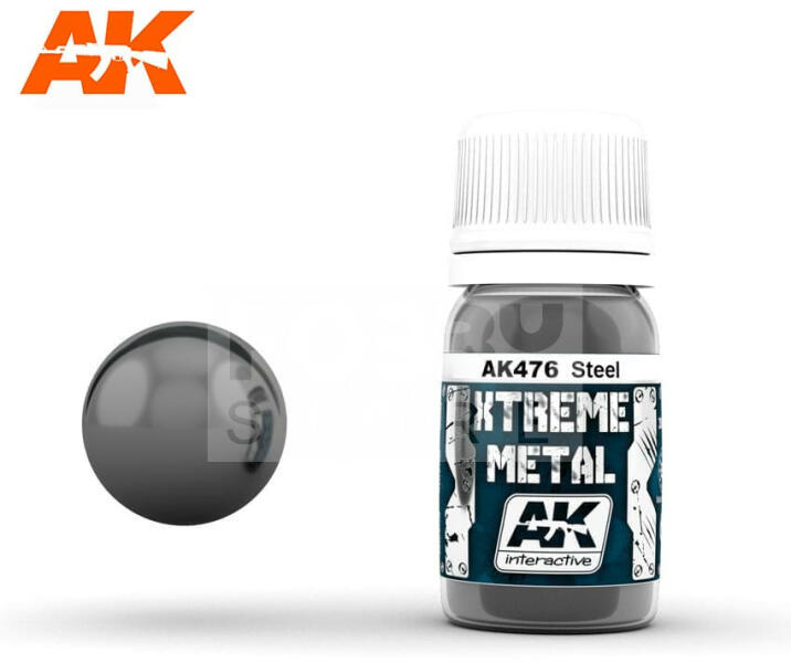 AK-Interactive Xtreme Metal - Steel festék 30 ml AK476 Az AK-Interactive Xtreme Metal festékek az egyik legjobban fedő terülő metál festék széria a picon, mely közvetlenül fújáshoz (airbrush használathoz van hígítva). Az Xtreme metál széria három speciális alapozót és egy tisztító folyadékot is magába foglal. Az Xtreme metál festékek használatával valósághű fémes f