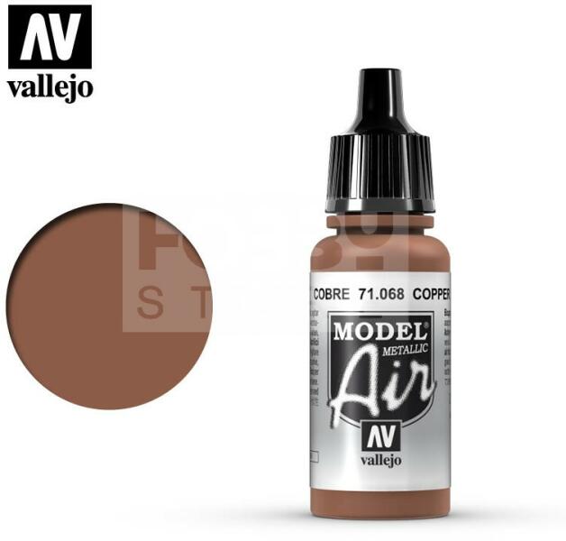 Vallejo Model Air Copper akrilfesték 71068V A Vallejo Model Air széria mattra száradó akrilfesték airbrush (szórópisztoly) használathoz lett kifejlesztve. A színválaszték a közelmúltban használt katonai színek legteljesebb választékát tartalmazza, beleértve az I. és a II. világháborút valamint a napjainkban használt színeket is. Mindegyik Model Air szín a meglévő és ko