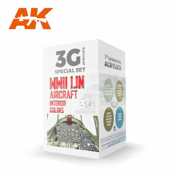 AK Interactive WWII IJN AIRCRAFT INTERIOR COLORS festék szett AK11738 Tematikus festékszett 4 darab AK Interactive 3. generációs festékkel . Új formulával rendelkező magas fedőképességű festék mely kiválóan alkalmas festékszóróval és ecsettel való használatra egyaránt. Speciális összetevőinek köszönhetően nem tömődik el festékszórónk, és felrázás után azonnal h