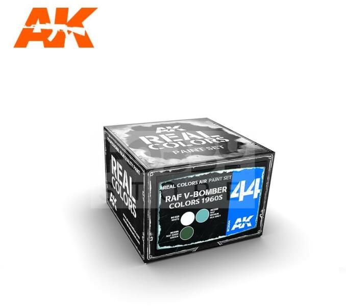 AK Interactive - REAL COLORS RAF V-BOMBER COLORS 1960S - festékszett RCS044 Tematikus festékszett 3 darab AK Real Color festékkel. Magas miőségű akril lakk bázisú festékszett modellezéshez-makettezéshez. Használatával a lehető legpontosabb színeket érhetjük el méretarányos modelljeinken. Rendkívül jól használható festékszóróval. Az AK -Interactive Real Color festékek ki