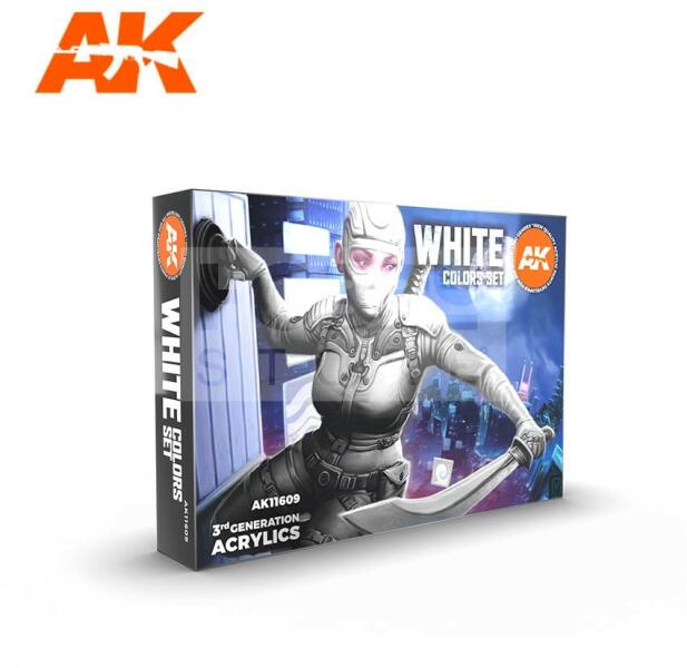 AK Interactive WHITE COLORS SET festék szett AK11609 Tematikus festékszett 6 darab AK Interactive 3. generációs festékkel . Új formulával rendelkező magas fedőképességű festék mely kiválóan alkalmas festékszóróval és ecsettel való használatra egyaránt. Speciális összetevőinek köszönhetően nem tömődik el festékszórónk, és felrázás után azonnal használható ecse
