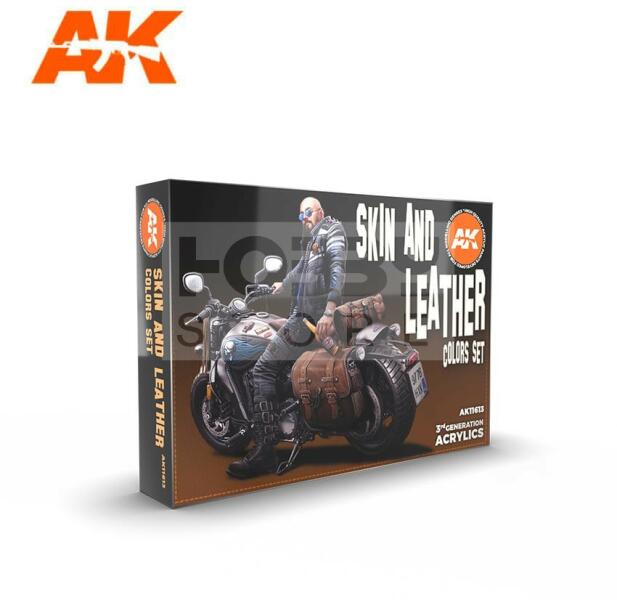 AK Interactive SKIN AND LEATHER COLORS SET festék szett AK11613 Tematikus festékszett 6 darab AK Interactive 3. generációs festékkel . Új formulával rendelkező magas fedőképességű festék mely kiválóan alkalmas festékszóróval és ecsettel való használatra egyaránt. Speciális összetevőinek köszönhetően nem tömődik el festékszórónk, és felrázás után azonnal haszná