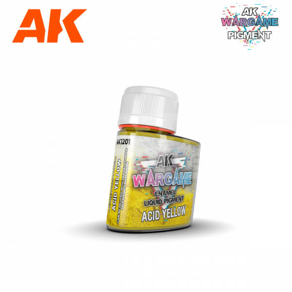 AK-Interactive - ACID YELLOW – ENAMEL LIQUID PIGMENT - Folyékony pigment sav sárga 35 ml AK1201 Az AK Interactive folyékony pigmentek minden wargame játékos és társasjáték festő számára lehetőséget ad, hogy különböző effekteket tudjanak elérni terepeken, figurákon, járműveken és basek-en. Fejlett formulája lehetővé teszi a pigmentek ellenőrzött használatát, és megk