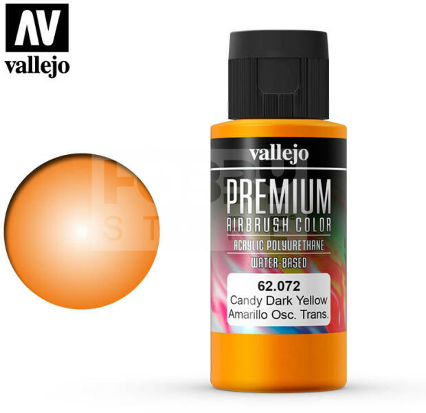 Vallejo Premium RC Colors Candy Dark Yellow akrilfesték (60 ml) 62072V A Vallejo Premium RC sorozatot kifejezetten airbrush (szórópisztoly) használathoz lettek kifejlesztve. Tulajdonságának fő erőssége, hogy optimális tapadást biztosítsanak üvegszál, polietilén, polikarbonát, fém és lexan felületeken. A Premium RC sorozat speciális tartós pigmentekkel és egy új rendkívül e