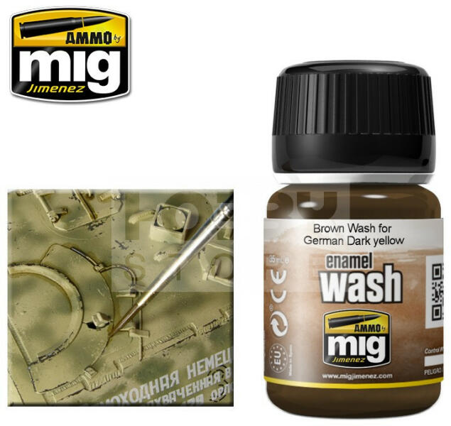 AMMO By Mig - BROWN WASH FOR GERMAN DARK YELLOW - bemosó folyadék makettezőknek 35ml - AMIG1000 Az AMMO Enamel alapú általános bemosó-átmosó effect folyadékok, melyek nagyon sokrétűen használhatóak. Alap technika a makettesek és wargamesek számára. Az AMMO By Mig effekt bemosók kiválóan alkalmasak a makettek, figurák koszolására élethű lerakodások (kosz, por, piszok, rozs