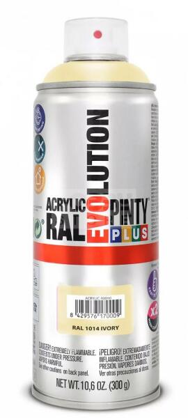 PINTYPLUS EVO AKRIL SPRAY RAL1014 - ELEFÁNTCSONT (IVORY) 400ML PP618 Az PintyPlus Evolution sorozat kiváló minőségű, magas pigmenttartalommal rendelkező, ultra gyorsan száradó, oldószeres akril festék spray család. A palettán 70 különböző szín, 3 lakk, 6 metál spray és 5 fluoreszkáló spray található. Univerzálisan használható, szinte bármilyen felületen. Magas pigment