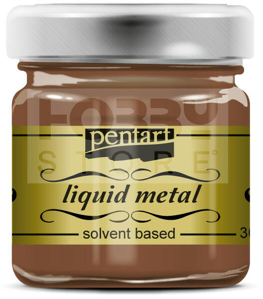 Pentart Folyékony fém réz 30 ml 21081 Magas fémpigment tartalmú, oldószeres festék, mellyel tökéletes fém-hatást érhetünk el. A festett felületet oldószeres fényes lakkal védjük. A festéshez használt ecsetet terpentines oldószerrel tisztíthatjuk. Használat elott alaposan fel kell rázni! Termék neveFolyékony fém- Liquid metalFelhasználási területmagas fémpigment tarta