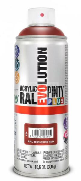 PINTYPLUS EVO AKRIL SPRAY RAL3009 - OXID PIROS (OXIDE RED) 400ML PP424 Az PintyPlus Evolution sorozat kiváló minőségű, magas pigmenttartalommal rendelkező, ultra gyorsan száradó, oldószeres akril festék spray család. A palettán 70 különböző szín, 3 lakk, 6 metál spray és 5 fluoreszkáló spray található. Univerzálisan használható, szinte bármilyen felületen. Magas pigment