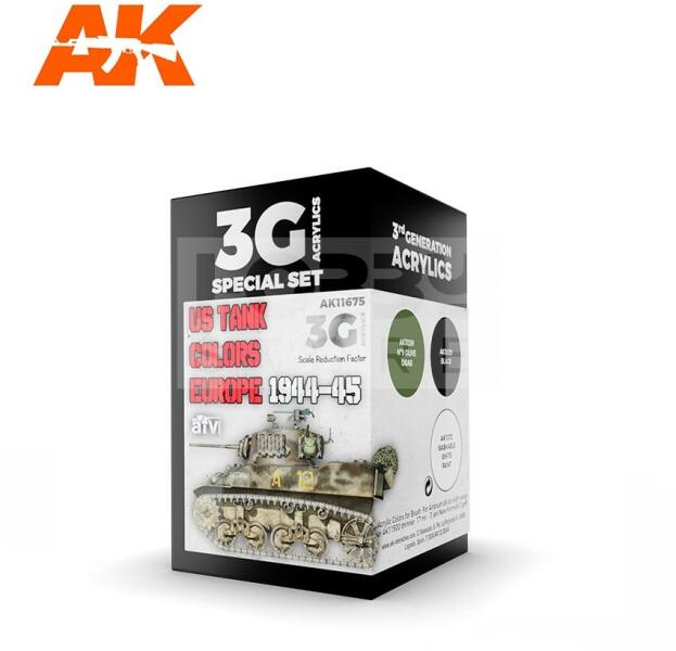 AK Interactive US TANK COLORS EUROPE 1944-45 festékszett AK11675 Tematikus festékszett 3 darab AK Interactive 3. generációs festékkel . Új formulával rendelkező magas fedőképességű festék mely kiválóan alkalmas festékszóróval és ecsettel való használatra egyaránt. Speciális összetevőinek köszönhetően nem tömődik el festékszórónk, és felrázás után azonnal haszn