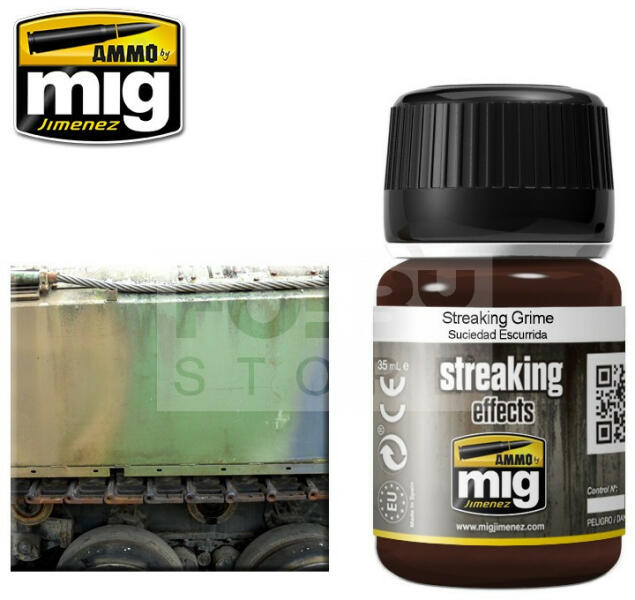 AMMO By Mig - STREAKING GRIME - koszoló folyadék makettezőknek 35ml - AMIG1203 Az AMMO By Mig Streaking Grimes effektekkel könnyedén hozhatunk létre különböző anyagok által okozott megfolyásokat, kosz csíkokat a makettek felületein . Az AMMO Enamel alapú általános bemosó-átmosó effect folyadékok, melyek nagyon sokrétűen használhatóak. Alap technika a makettesek és wargame