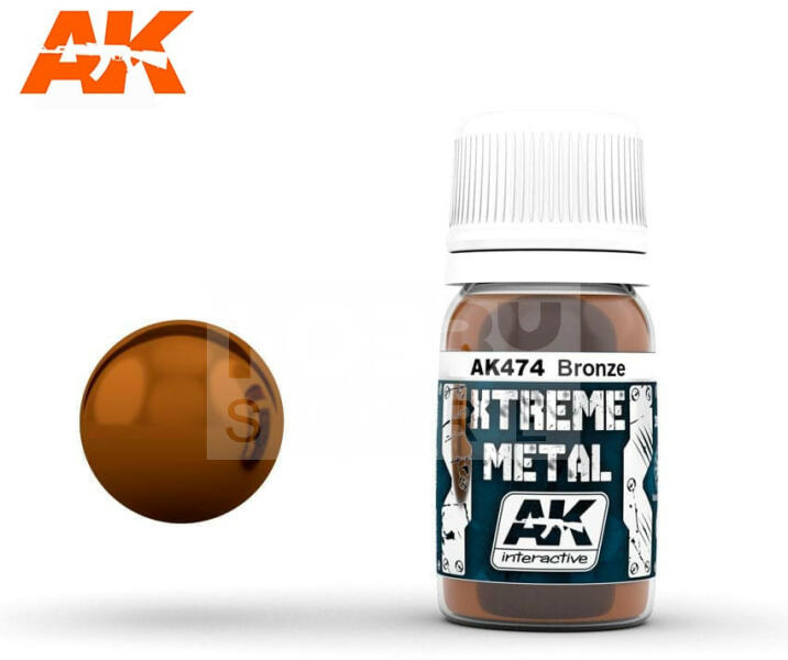 AK-Interactive XTREME METAL BRONZE festék 30 ml AK474 Az AK-Interactive Xtreme Metal festékek az egyik legjobban fedő terülő metál festék széria a picon, mely közvetlenül fújáshoz (airbrush használathoz van hígítva). Az Xtreme metál széria három speciális alapozót és egy tisztító folyadékot is magába foglal. Az Xtreme metál festékek használatával valósághű fémes fe